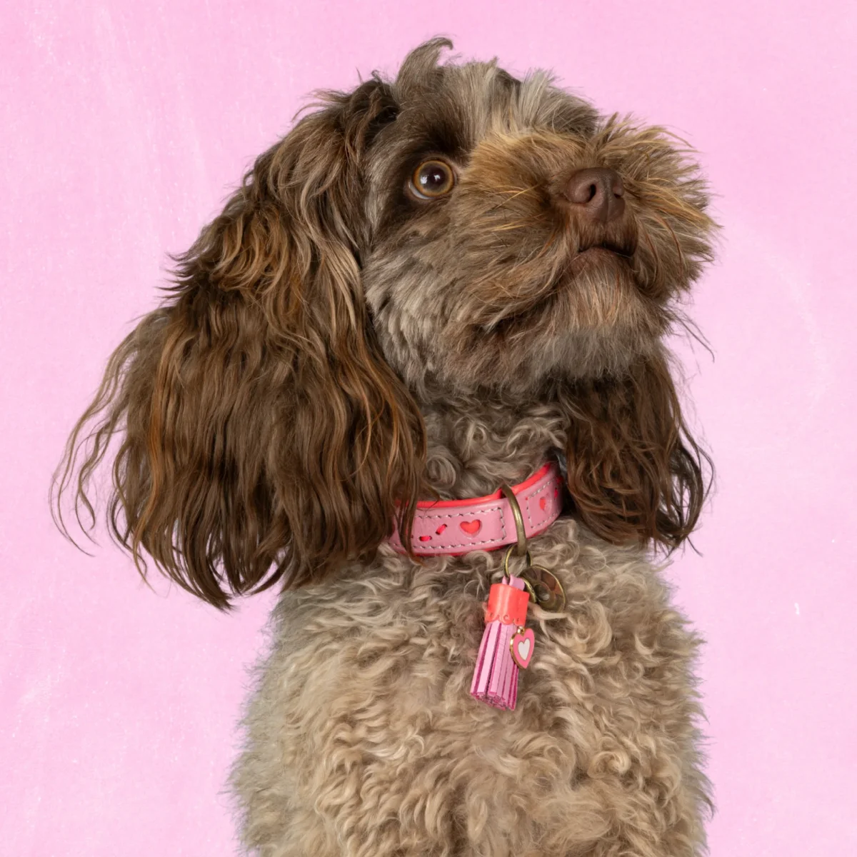 Halsomvang: 25-29 cm (XS) | Breedte: 2 cm | Materiaal: Buffelleer | Kleur: Roze leer met uitgesneden hartjes | Hardware: Messing | Handgemaakt