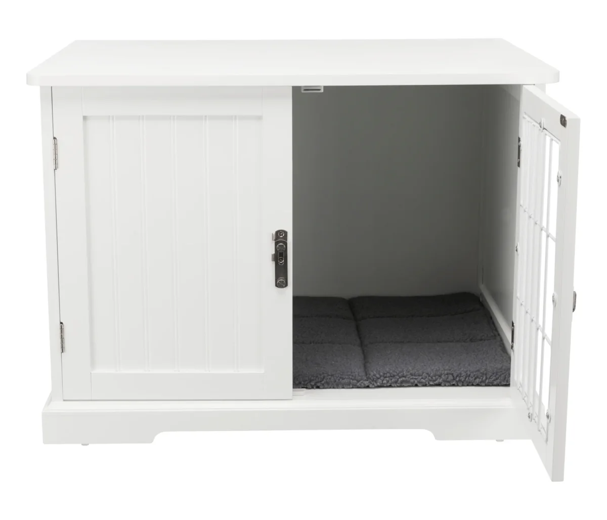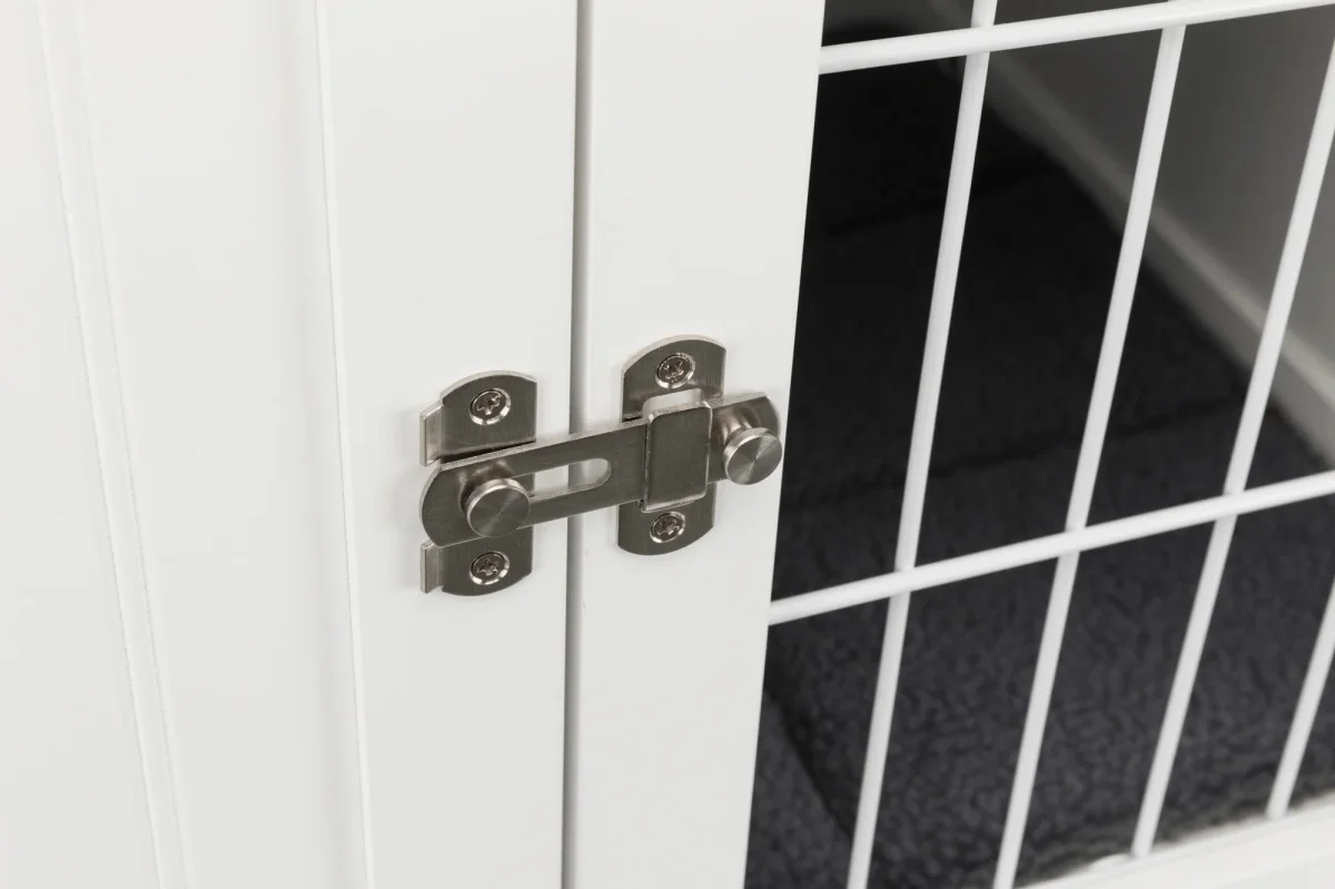 De Trixie Bench Home Kennel Hond Wit 73 x 53 x 53 cm is een comfortabele, houten kamerbench voor de hond, gemaakt van hout met traliedeur en mat in schapenvachtlook.