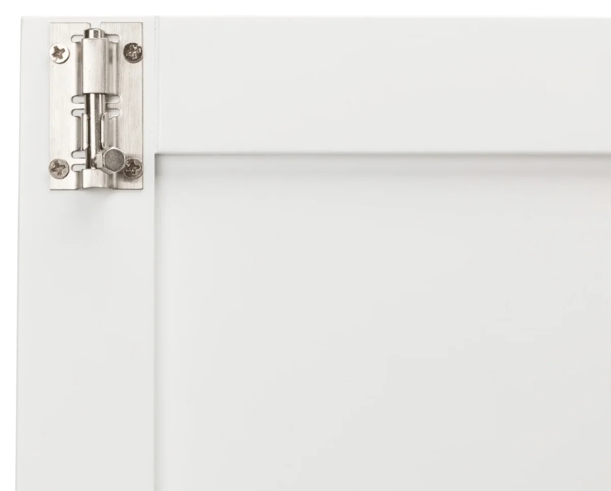 – Van witgelakt MDF, met deur van tralies