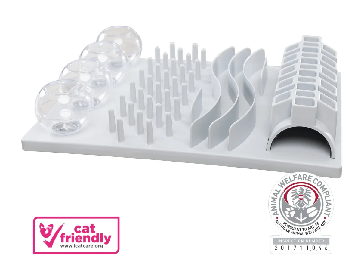Het uitdagende Trixie Cat Activity Fun Bord bordspel bevat vijf verschillende spellen waarmee je jouw kat kunt uitdagen om op een speelse manier een snack te verdienen. Leg een snack of brokje in de tunnel, in een vakje, een gleuf, tussen de pinnen of in een van de bakjes. De kat zal zijn pootjes en behendigheid moeten gebruiken om de beloning te pakken te krijgen. Dit is ook te doen met gewoon voer, waardoor je kat langer bezig zal zijn met eten en dus minder de kans heeft zijn voer naar binnen te schrokken.