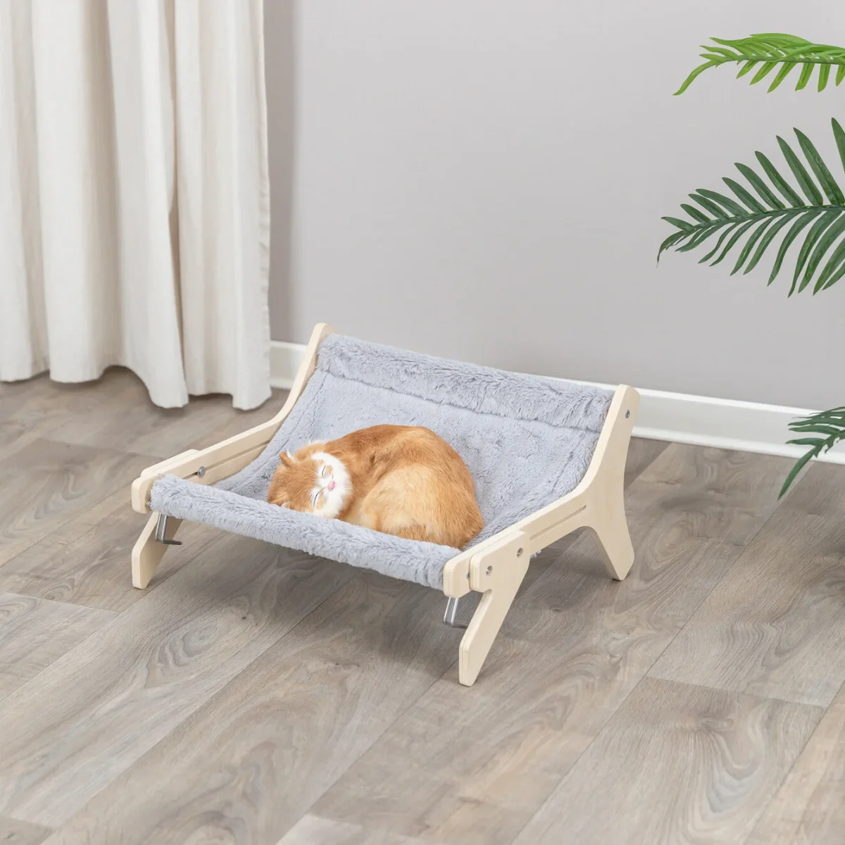 De Trixie Hangmat Hout Onbehandeld Grijs biedt jouw kat een luxe en comfortabele rustplek met veelzijdige bevestigingsopties. Deze stijlvolle hangmat kan vrijstaand worden gebruikt of eenvoudig worden bevestigd aan een bedframe of verwarming dankzij de verstelbare beugels. De houder is voorzien van een plastic coating en vilten glijders, die je meubels beschermen tegen krassen en slijtage. De afneembare bekleding is eenvoudig schoon te maken, en de hangmat heeft een draagvermogen tot 12 kg, geschikt voor katten van diverse formaten.
