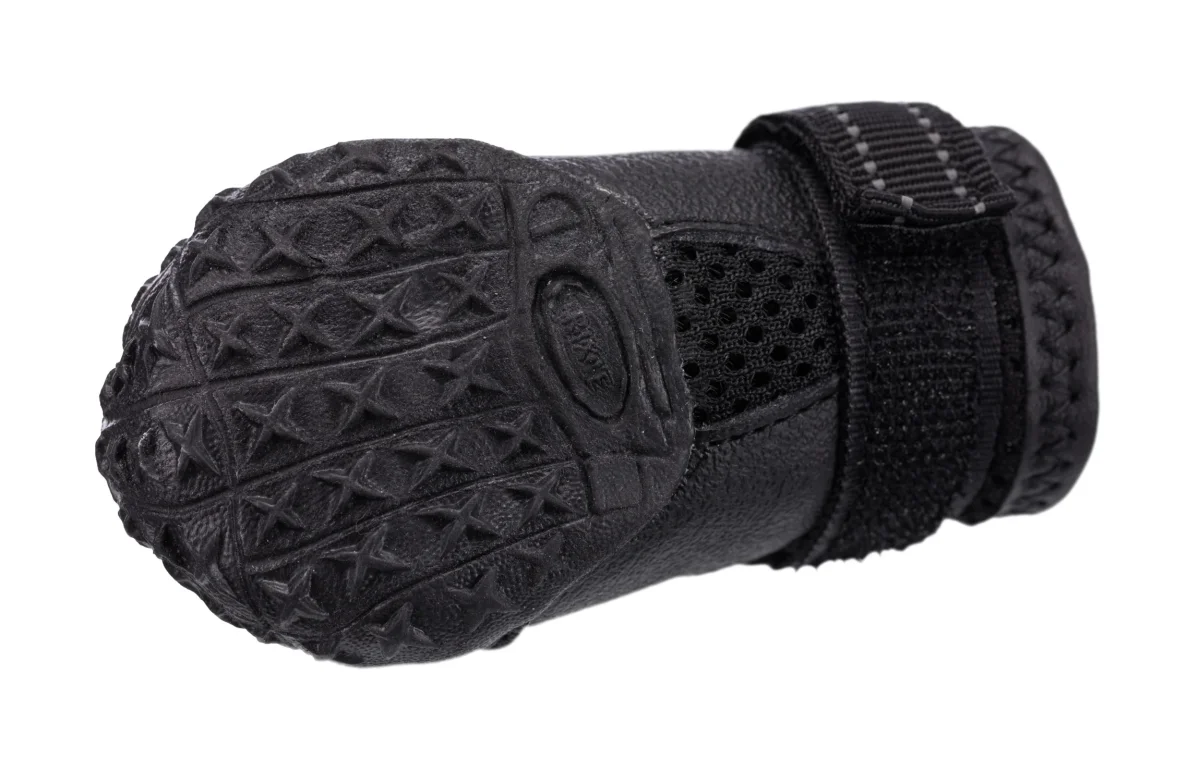 De poten en voetkussentjes zijn bij veel honden een gevoelig lichaamsdeel. In veel seizoenen, met name tijdens extreme warmte en kou, hebben de zooltjes van jouw viervoeter veel te verduren. In dergelijke situaties komen deze handige Active Walkers van Trixie zeer van pas! Deze duurzame pootbescherming beschermt jouw viervoeter gedurende elk seizoen en elk avontuur: de hond heeft geen last meer van zeer hete ondergronden, steentjes in de zooltjes en is eveneens beschermen deze schoenen tegen strooizout en gruis in de wintermaanden. De zooltjes zijn slipvast voor meer veiligheid en dragen erg prettig door het ademingsactieve mesh-materiaal. Deze duurzame beschermingsschoenen zijn met de klittenbandsluiting eenvoudig aan en uit te trekken en bovendien voorzien van reflecterende strepen, voor meer zichtbaarheid en dus veiligheid in het donker. Zo blijven de poten van de hond mooi beschermd tijdens het wandelen en kunnen jullie nog meer van elk avontuur genieten!