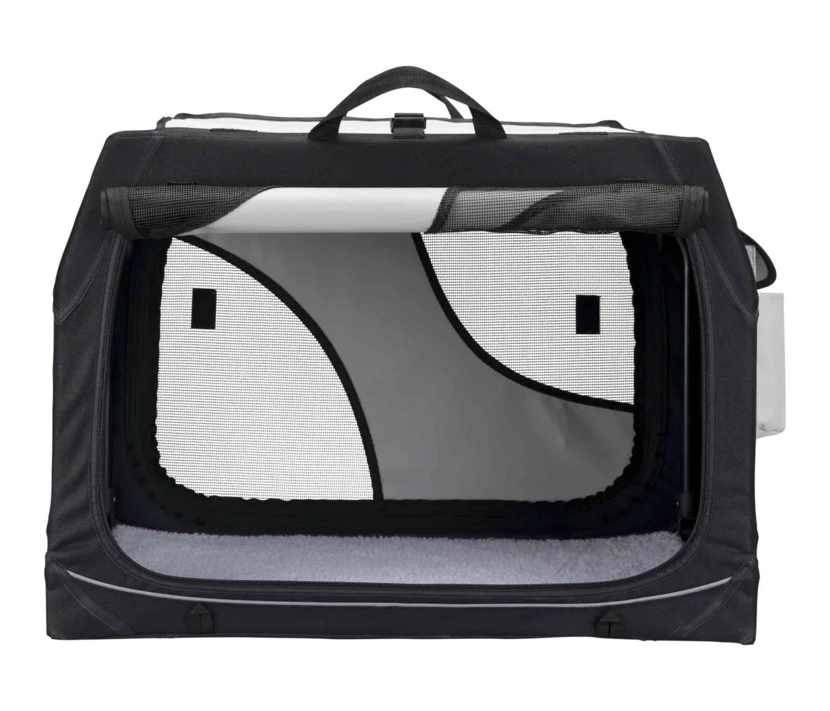 De Trixie Reismand Vario Zwart/Grijs 61X43X46 cm is een stevige vervoersbox van duurzaam polyester met een metalen frame. De reismand is aan drie kanten te openen en is voorzien van gaas-inzetstukjes voor goede ventilatie. Het bovenste gaas-inzetstukje is ter bescherming van de hond afdekbaar. Het klittenband aan de onderkant van de box houdt hem goed op zijn plaats en de afneembare flap beschermt de bumper tegen krassen. Door de lussen aan de onderkant en haringen is de reismand ook buiten in de vrije natuur te gebruiken. De box is voorzien van een zijvak en fleshouder. De losse bodem met schapenvacht look geeft de hond een behaaglijk gevoel!