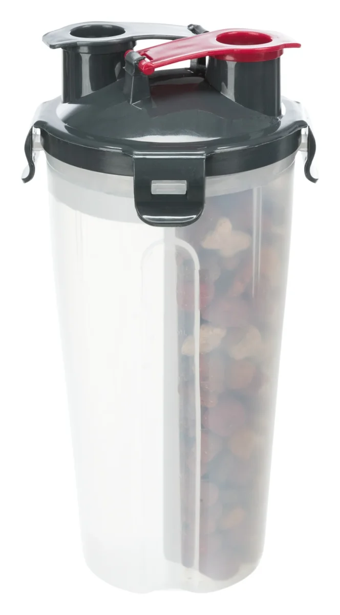 De Trixie Waterfles / Voerfles Inclusief Reisbak Kunststof / Siliconen 11X11X23 cm 2X350 ml is een fles met voer- en waterreservoir, ideaal voor op reis of lange wandelingen. De kunststof fles is in tweeën gedeeld, zodat er één compartiment is voor voer en één voor water. Door de aparte openingen kun je zelf kiezen welk compartiment je wilt legen. De fles komt met een invouwbare bak van siliconen waar je het water of het voer in kunt aanbieden. Met de haak hang je hem eenvoudig aan jouw tas en gaat hij ook mee op reis, fietstochten of lange wandelingen. Voor gemakkelijk schoonmaken kun je ook het gehele deksel verwijderen.
