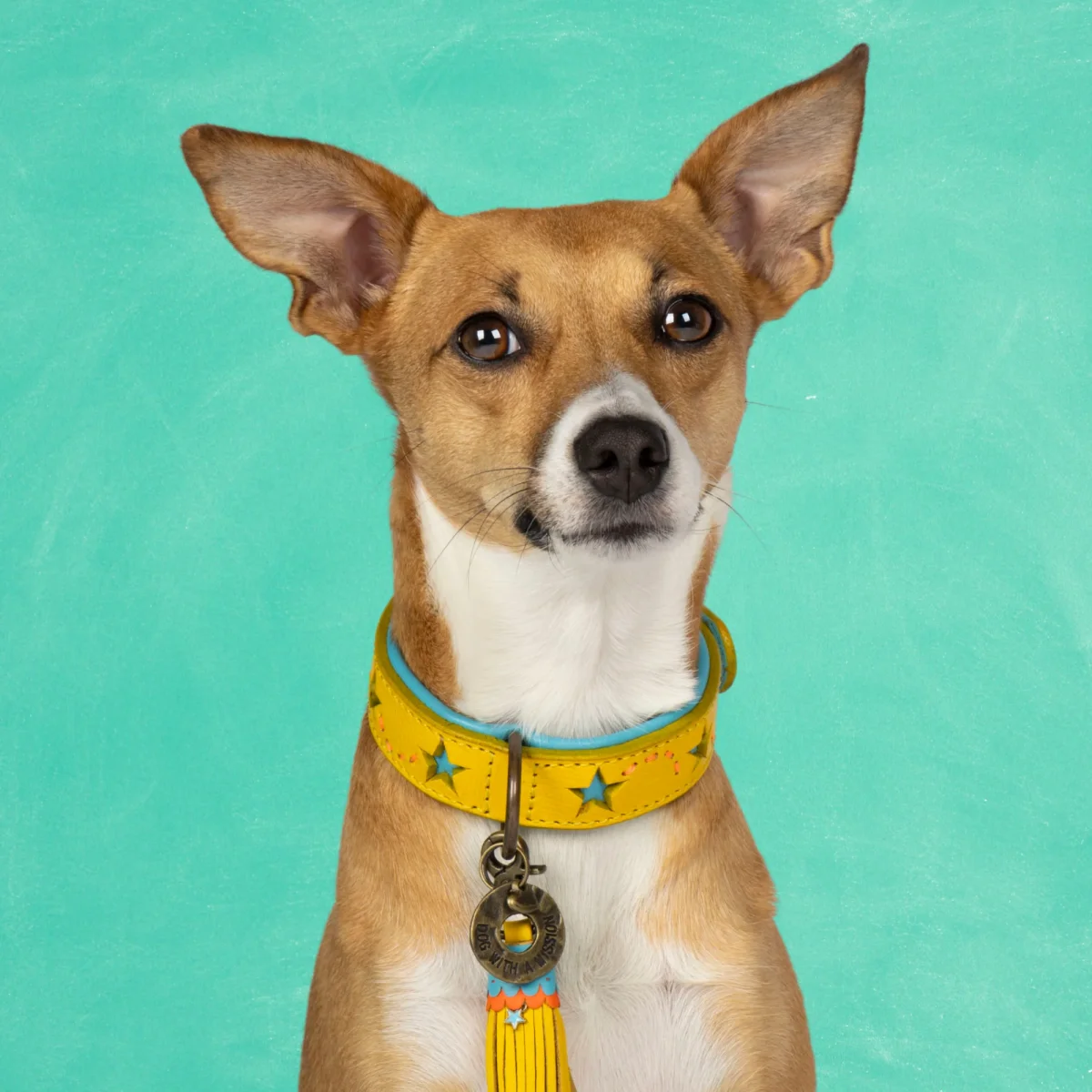 Halsomvang: 30-33 cm (S) | Breedte: 2,5 cm | Materiaal: Buffelleer met leren voering | Kleur: Felgeel leer met lichtblauwe voering en blauwe sterren | Hardware: Messing | Handgemaakt