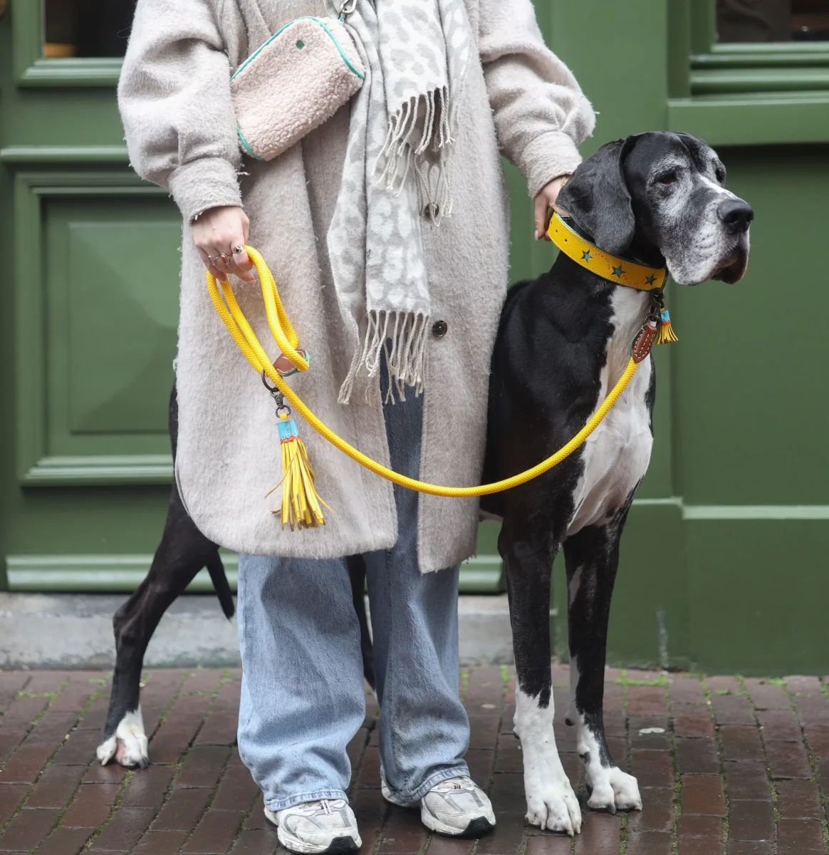 De Urban Blue Star hondenhalsband uit de Urban collectie brengt vrolijke stedelijke stijl naar elke wandeling. Deze handgemaakte halsband in maat S (halsomvang 30-33 cm, breedte 2,5 cm) is gemaakt van felgeel buffelleer met een lichtblauwe leren voering aan de binnenkant. De halsband heeft opvallende blauwe sterren die de halsband een speelse, vrolijke uitstraling geven. De combinatie van felgeel en lichtblauw leer met de blauwe sterren maakt deze halsband een echte eyecatcher. Perfect voor kleine honden die opvallen met een vrolijke, speelse look.
