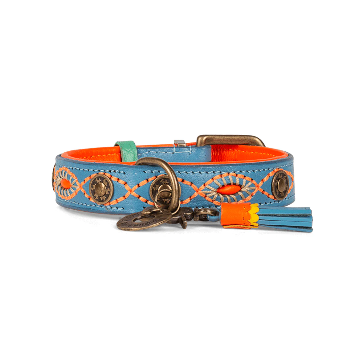 Halsomvang: 30-33 cm (S) | Breedte: 2,5 cm | Materiaal: Buffelleer | Kleur: Blauw leer met oranje stiksels | Hardware: Messing | Handgemaakt