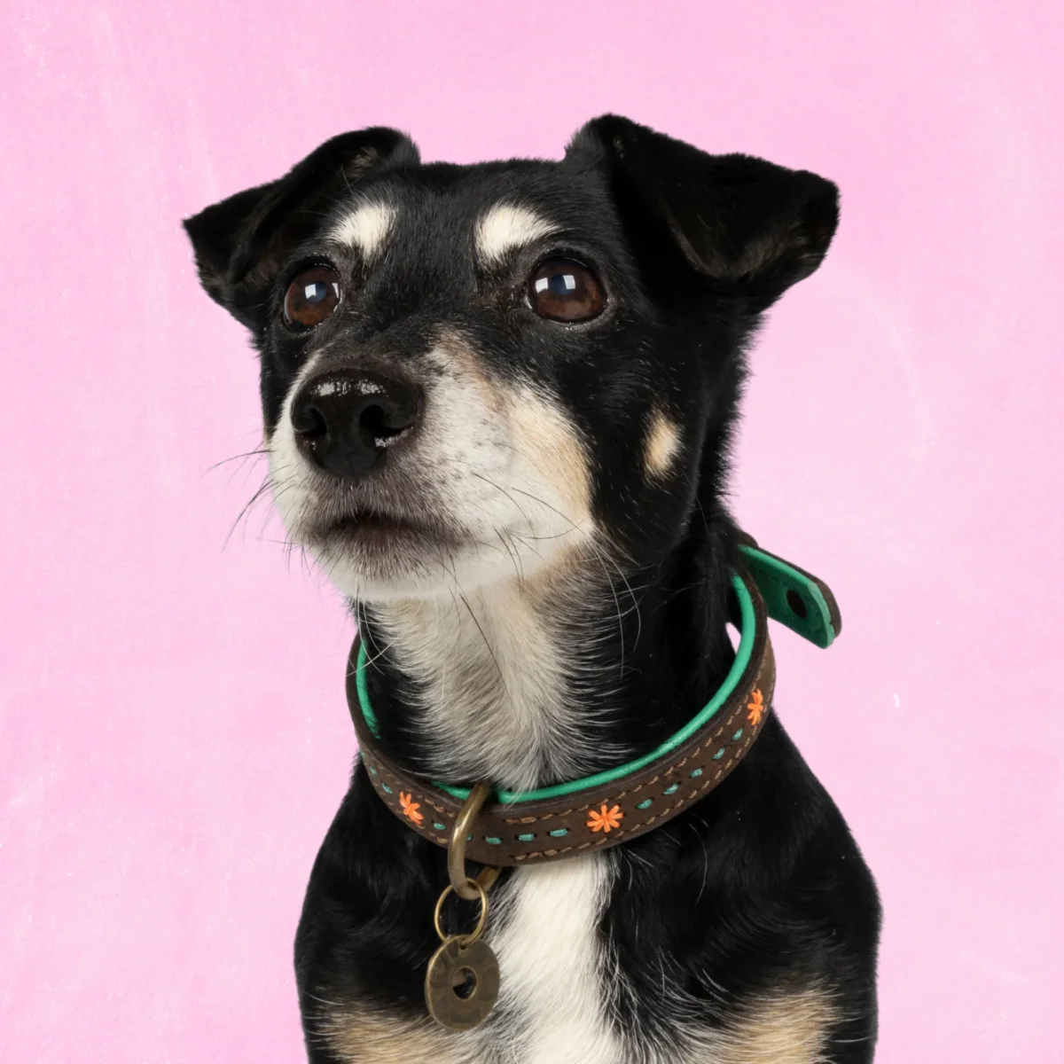 Halsomvang: 30-33 cm (S) | Breedte: 2 cm | Materiaal: Buffelleer met leren voering | Kleur: Bruin leer met turquoise voering en oranje en turquoise handgestikte details | Hardware: Messing | Handgemaakt